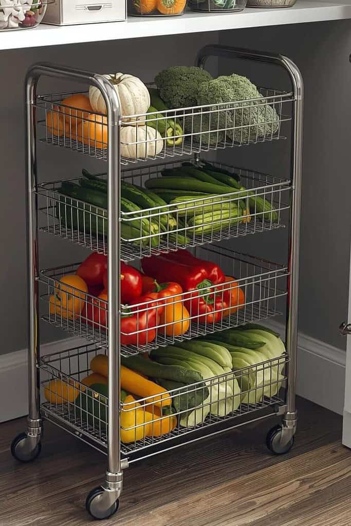 These carts are ideal for storing vegetables, fruits, onions, or potatoes since they don’t need refrigeration. They are a great solution that uses vertical space efficiently while keeping items easy to access. You can simply roll the cart out when needed and tuck it back in when you are done.